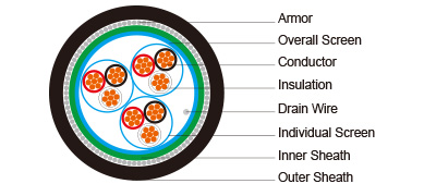 | Individual Screen: | Aluminium/polyester tape is applied over each pair metallic side down in contact with tinned copper drain wire, 0.5mm² |